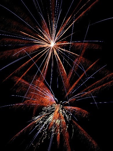 烟花是一个个快速爆裂的光点,因为视觉残留的原因,当烟花在天空中炸开并向下坠落时,就形成了我们看到的“花”,但是当相机曝光时间太短,只能捕捉到烟花爆裂的瞬间,成像也就是斑斑点点支离破碎。