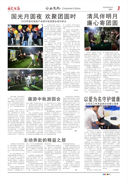 这次中秋游园会,不仅让我们感受到了中秋佳节的喜庆氛围,更让每一位国光人都体会到了公司大家庭的温暖。作为工作人员,我既见证了同事们的快乐,也收获了满满的感动,相信这份温暖与快乐,会化作大家工作的动力。让我们在未来的日子里,继续携手同行,共同为公司的发展努力。